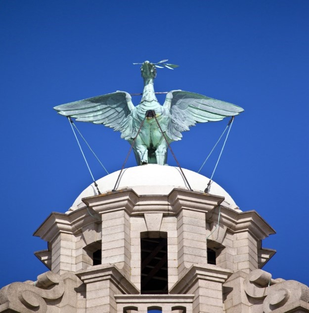 Bella, one of the liver birds atop the Royal Liver Building in Liverpool