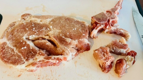 Second, cuts of meat differ around the globe. What Robie and I found in our small market in Ikaria was called “pork steak” and looked like thinly sliced pork blade with bones and clearly defined muscle groups. For American cooks, Robie suggests using cubed pork shoulder, but you could use center-cut chops (deboned) or shanks.