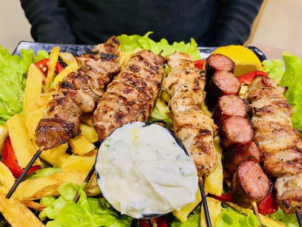 The shellfish come with shells on, and the cuts of meat include bones because that’s the way they’re butchered in Albania. But if you prefer your meat boneless, we suggest ordering the skewers which are cleaned, cubed and come in every variety. The salads and sides are delicious and big enough to feed four. Or you can take the leftovers for a lovely lunch the following day.
