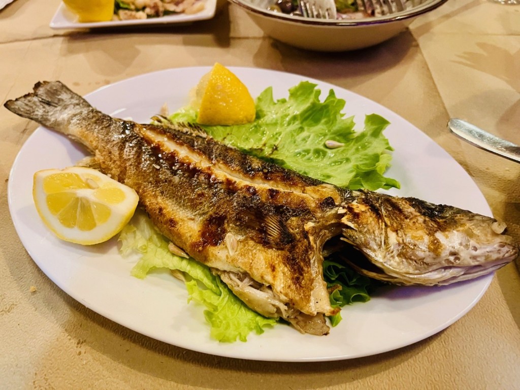 The owner has a fish shop nearby but that doesn’t mean every dish is available if the catch didn’t make it on the boat. It does mean that by cutting out the middleman, Taverna Kapiteni offers a delicious meal for less, like our large salad, cheese appetizer, whole fish, calamari and wine that came in under €34, a price that’s hard to beat anywhere in Sarandё.