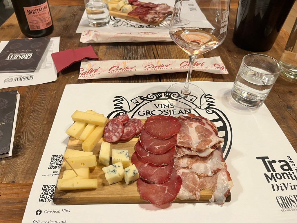 When we visited a small family run winery, Grosjean Vins, we were fortunate to be the only people on the tour and to witness the crush of the Pinot Noir grapes. As a wine lover, I enjoyed learning about the process from the crushing of the grapes to the aging to the bottling. The wine-tasting and charcuterie board at the end of the tour was a tasty highlight.
