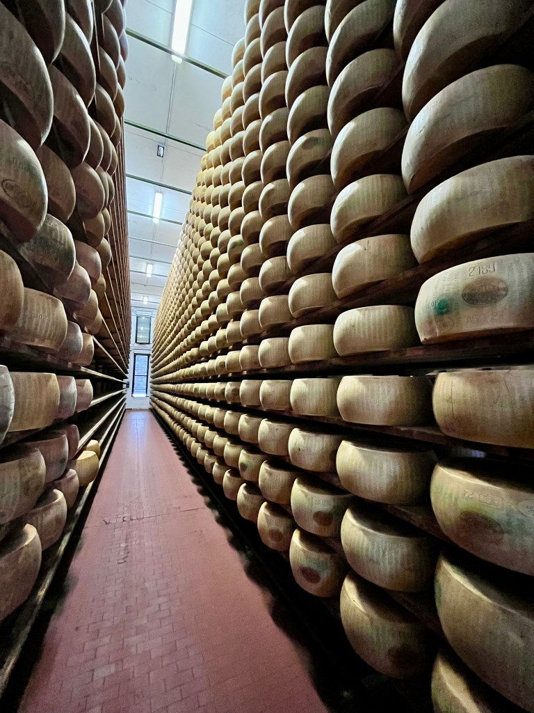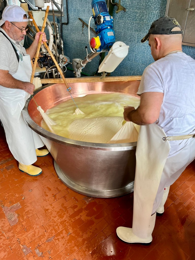 During your stay in Parma I highly recommend a visit to a local cheese factory where they make Parmigiano Reggiano or a ham factory where Prosciutto de Parma is made. I had the pleasure of touring a local family-run cheese factory, Caseificio Ugolotti, and found the process fascinating and very informative. I learned it takes 500 liters of milk to make one 80-pound round of cheese followed by at least 12 months of aging before it can be proclaimed Parmigiano Reggiano – providing it meets the exacting standards of the Parmigiano Reggiano Consortium.
