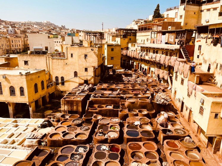 From this height we have a view of the open pit below where wiry men, leathered from the sun and dressed only in loincloths, wade in huge vats. “Over there is where the hides are dried, cleaned and softened,” Sayed explains pointing to one area surrounded by tall buildings.