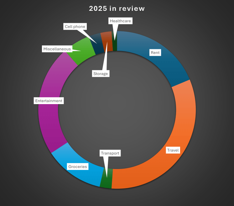 While it covers things like our Microsoft and WordPress subscriptions, books bought on Kindle and accountant fees, in 2025 it also included new socks in Agadir, a grill and fishing pole in Sarandё, access to a pay toilet in Italy, an electric toothbrush brought from home, a Morocco national soccer jersey to cheer the home team in the Africa Cup of Nations and 62 days for a storage unit in Madrid so we could leave our things while traveling as well as new luggage to allows us to be more mobile.