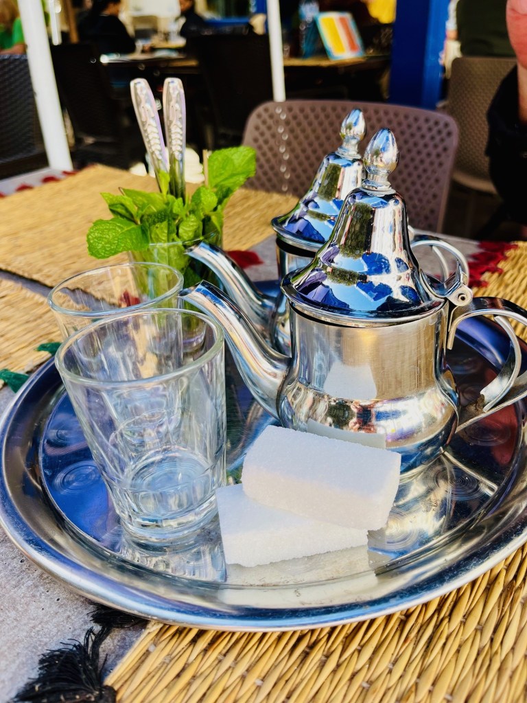 Our culinary tour of Morocco begins with the country’s famous symbol of hospitality made from Chinese gunpowder green tea loaded with fresh mint sprigs sweetened by sugar. Moroccan mint tea is best enjoyed at a café watching the bustling souk or medina while getting to know the friendly, four-legged locals and listening to the traditional Berber music of strolling musicians.