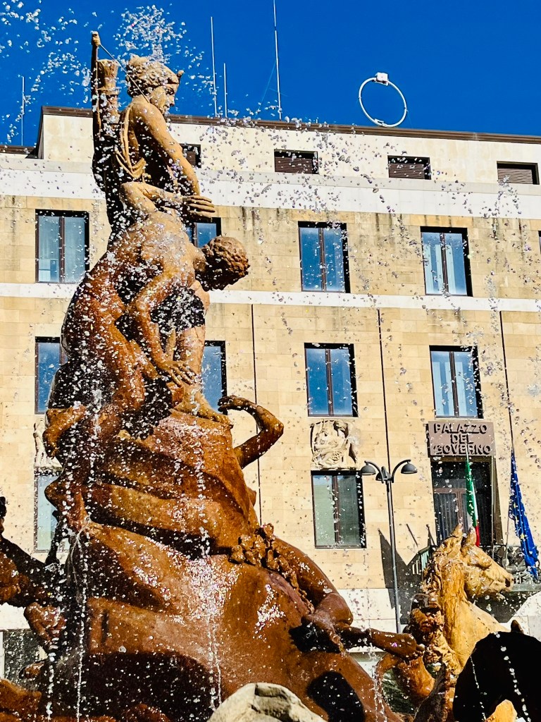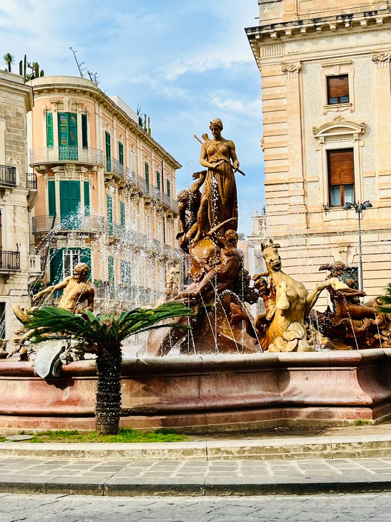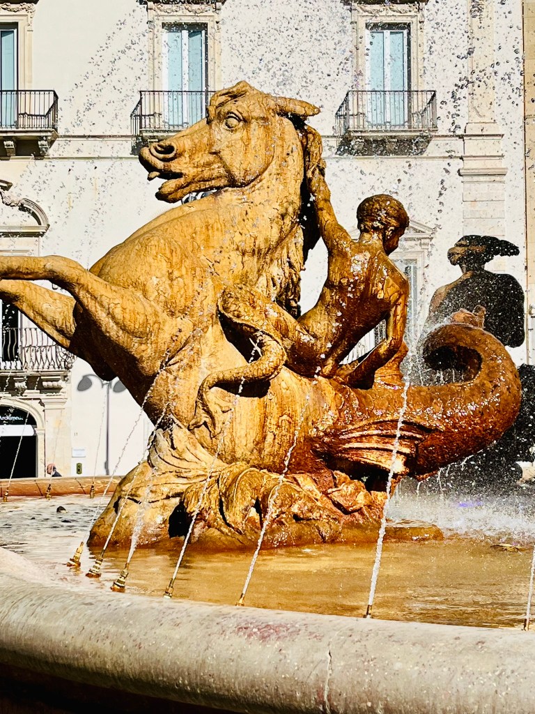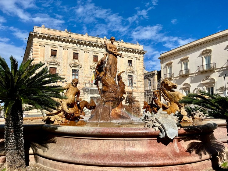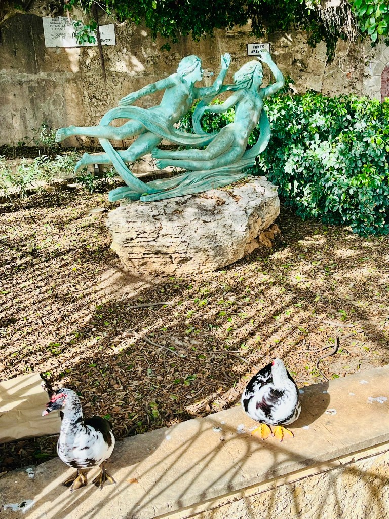 In the center of Ortigia we wandered around Piazza Archimede, a square named for the famous Greek scientist and inventor. In the center of the piazza sits a fountain depicting a scene from Arethusa’s mythical transformation. Surrounded by Tritons, Diana (the Roman name for Artemis) watches Arethusa’s escape, ready with a bow and arrow to protect the nymph as she morphs into the nearby spring where today migrating geese swim among papyrus.